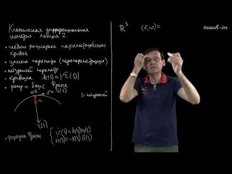 00:00:19 Тема лекции 00:00:31 Классическая дифференциальная геометрия 00:02:09 Понятие кривой. Параметрическое описание кривой 00:11:36 Производные 00:13:04 Первое строгое определение кривой 00:21:56 Перепараметризация кривой 00:26:50 Ориентация параметризованной кривой 00:28:40 Классы эквивалентности параметризованных кривых 00:31:20 Обозначения отображений 00:49:07 Кривизна кривой. Определение натурального параметра 01:03:35 Единственность натурального параметра 01:08:25 Определение кривизны кривой в случае натуральной и произвольной параметризации 01:13:05 Случай плоских кривых. Лемма. Базис Френе 01:20:28 Вывод формулы Френе. Утверждение о кривизне |