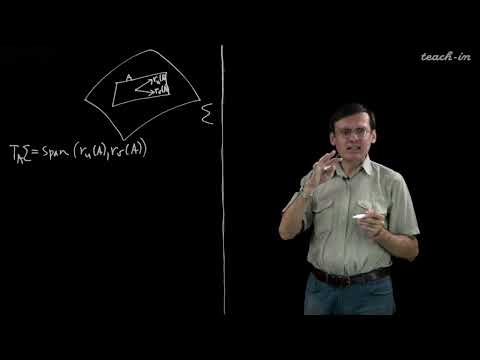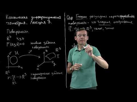 00:00:19 Тема лекции 00:00:38 Параметрически заданные поверхности. Одномерный случай 00:05:13 Условие регулярности 00:09:20 Переход от неявно заданной поверхности к гладкой регулярной параметризованной поверхности 00:10:17 Определение неявно заданной поверхности в \( R^3 \) 00:13:08 Описание гладкой неявно заданной поверхности, как гладкой регулярной параметризованной поверхности 00:20:12 Случай сферы 00:25:12 Многомерный случай 00:29:40 Определение гладкой неявно заданной k-мерной поверхности в n-мерном пространстве. Упражнение 00:35:31 Терминология 00:39:32 Кривые на поверхности 00:48:24 Утверждение об эквивалентности описаний кривых 00:57:00 Касательные векторы 01:06:25 Касательная плоскость |