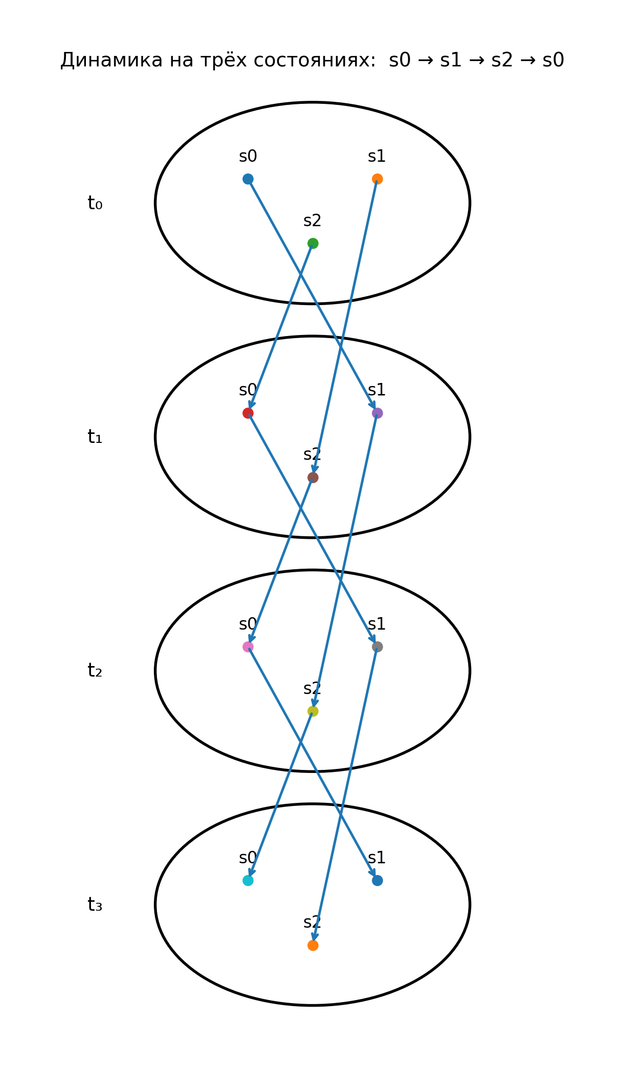 Здесь в момент времени \( t_0 \) задано состояние \( s_0 \), которое в момент времени \( t_1 \) переходит в состояние \( s_7 \), а затем, в момент времени \( t_2 \) - в состояние \( s_5 \)