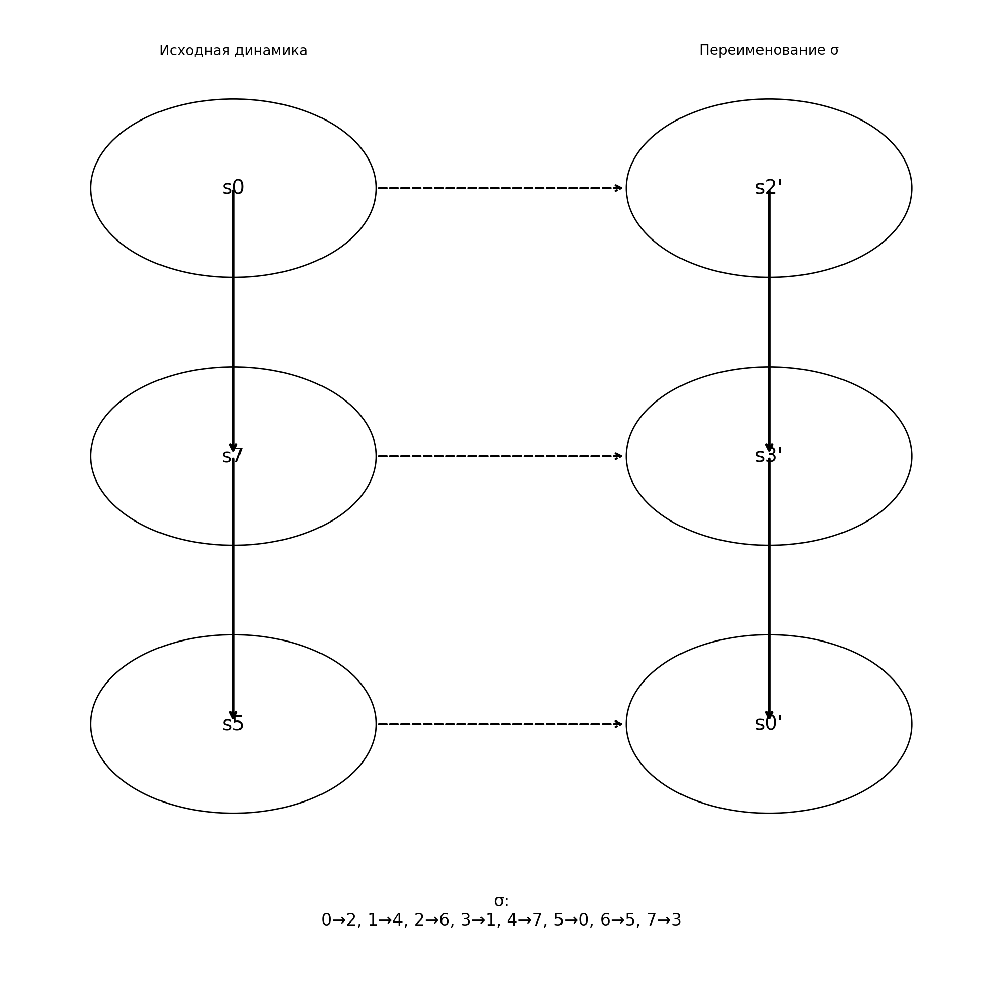 Итак, рассмотрим систему из нескольких (здесь для примера 8) состояний и ее динамику. Состояние s0 на следующем шаге эволюции переходит в s7, затем s5. Но эти состояние можно переименовать с помощью любой перестановки, например, указанной на рисунке. Номера состояний изменились и запись динамики, соответственно, изменилась тоже, но лишь на уровне обозначений, ведь структура переходов осталась прежней, поскольку мы хотим иметь дело не с конкретными именами состояний, а именно со структурой отображения.