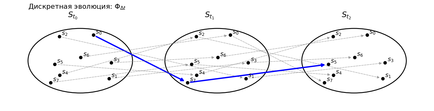 - есть эволюция \( \Phi_t \) - это отображание, которое переводит точки множества S в другие очки множества S (тюе. описывает разворачивающуюся динамику), в частности, переводит некоторое состояние в другое на шаге t