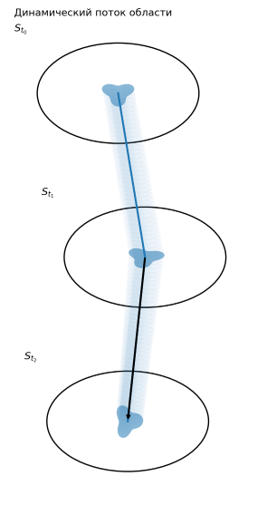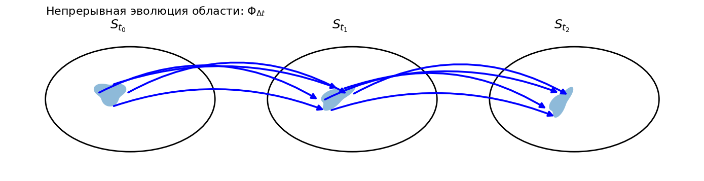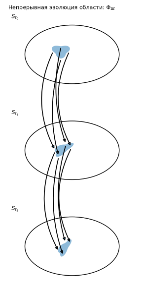 Если точки-состояния образуют непрерывные области, и эволюция тоже имеет свойства гладкого отображения, то схему можно видеть следующим образом